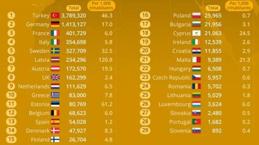 Kje živi največ beguncev v EU / v Sloveniji imamo 0,4 begunca na 1000 prebivalcev