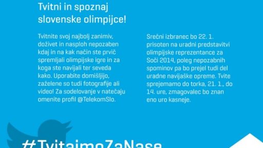 20/01/2014 #TvitajmoZaNase – Telekom Slovenije in Olimpijski komite Slovenije Kljub temu, da mi oblačila naših športnikov, ki bodo zastopali Slovenijo na zimskih olimpijskih igrah v Sočiju niso…
