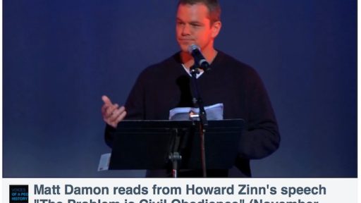 24/11/2013 Matt Damon in govor Howarda Zinna – The Problem is Civil Obedience Howard Zinn je bil ameriški zgodovinar, pisec, ki je napisal več kot 20 knjig in družbeni aktivist. Matta Damona…
