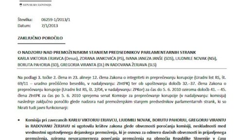 08/01/2013 Janez Janša, Zoran Jankovič in Komisija za preprečevanje korupcije Komisija za preprečevanje korupcije je izdala Zaključno poročilo nadzora nad premoženjskim stanjem predsednikov parlamentarnih strank, ki so hkrati…