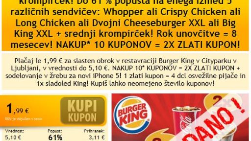 06/12/2012 1nadan.si in Burger King z veliko akcijo za 1,99€ omogočila 35.000 obrokov – hmm, kaj res? O skupinskih nakupih sem pisal že večkrat. Eden izmed prvih, ki je oral ledino, je bil BigDeal –…