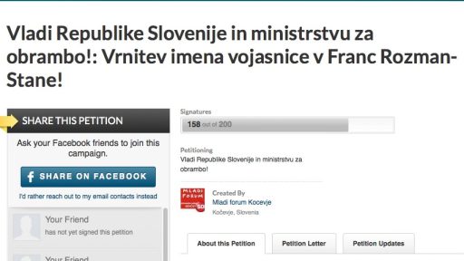 29/06/2012 Proti preimenovanju vojašnice Franca Rozmana Staneta Franc Rozman – Stane, narodni heroj, je bil slovenski španski borec, partizan, general in narodni heroj, ki je…