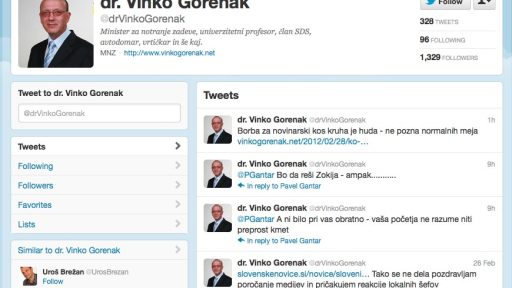 28/02/2012 dr. Vinko Gorenak in njegovo tvitanje dr. Vinko Gorenak, minister za notranje zadeve, ima zanimiv Twitter “nickname” @drVinkoGorenak, da ne bi slučajno kdo pomislil…