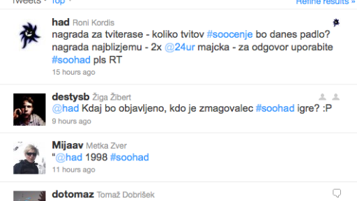 02/12/2011 Twitter nagradna igra #soocenje – 6423 tvitov #soocenje Soočenja na POP Tv so zadnje čase zanimiva za uporabnike Twitterja v Sloveniji, saj se lahko njihov tvit…